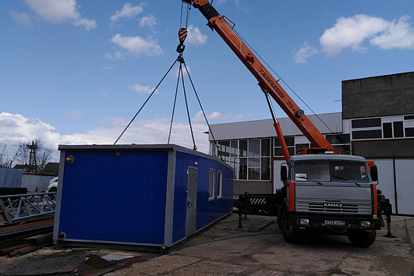 Так как данное строение является негабаритным грузом, то для его перевозки используется кран-манипулятор. Для перевозки деревянных бытовок подойдет манипулятор с небольшой грузоподъемностью стрелы крана. Что касается металлических бытовок, то для их транспортировки стоит заказать кран-манипулятор с грузоподъемностью – как минимум 4 тонны.